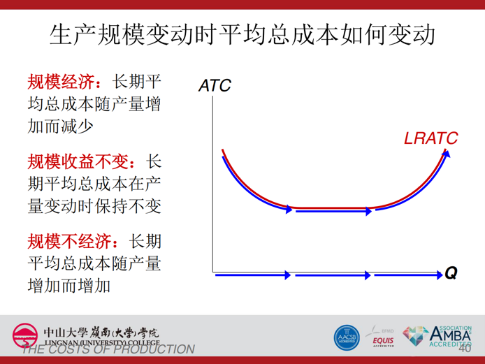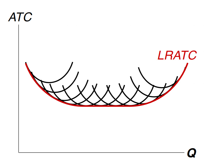 - 在长期里,在任何产量的平均总成本都是使用生产那个产量的最有效率的投入的成本(比如在平均总成本最低的工厂规模时生产